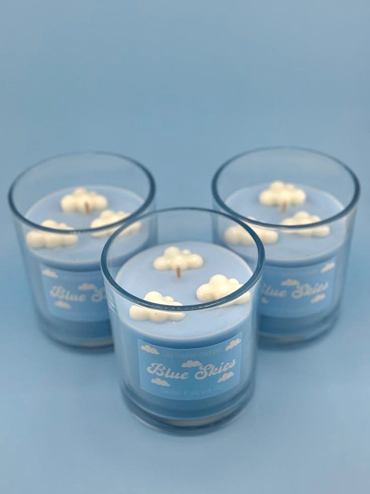 Clean blue wax with delicate cloud accents. Fresh, calming and perfect for modern interiors.