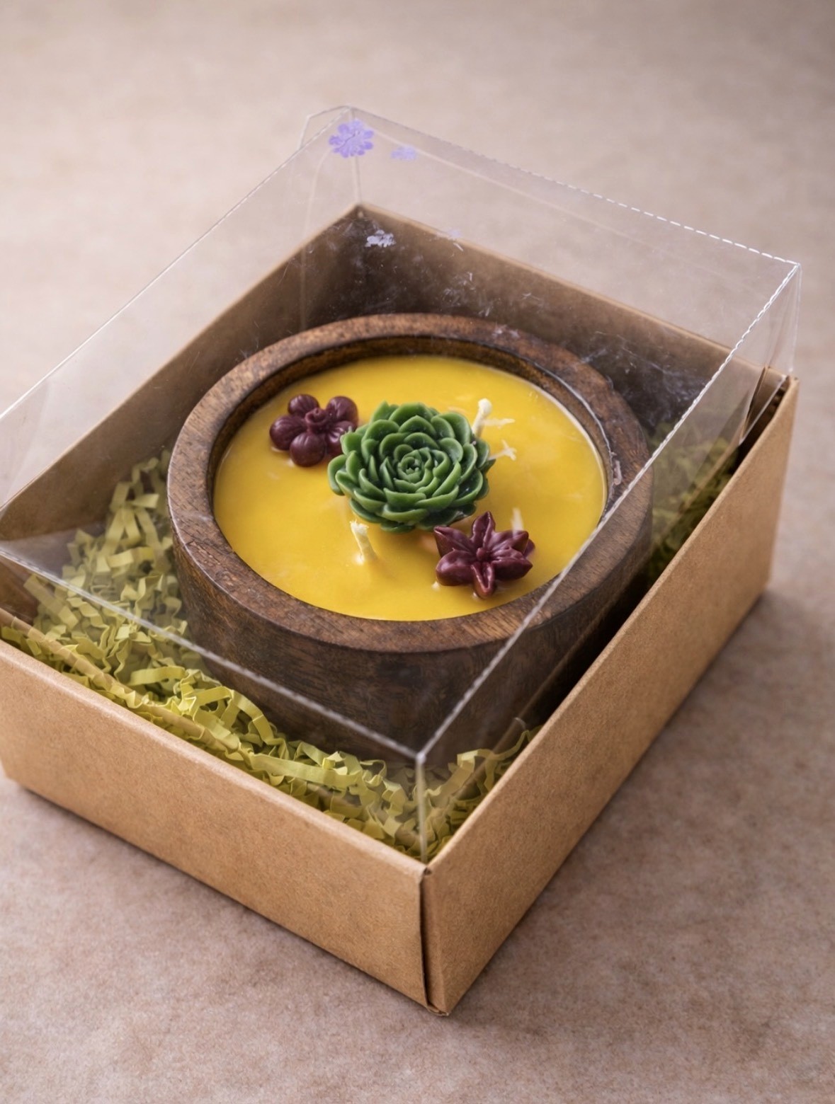 Hand-poured heart-shaped wooden tray candle with floral accents. Perfect for romantic gifting and special occasions.